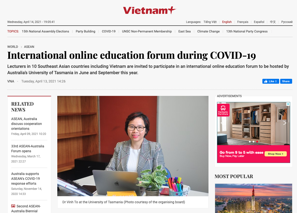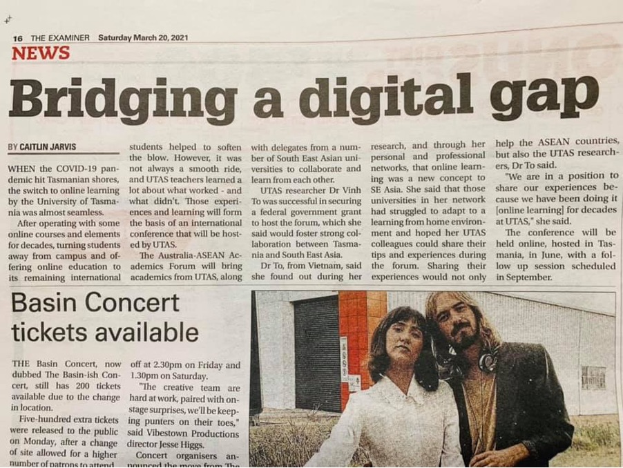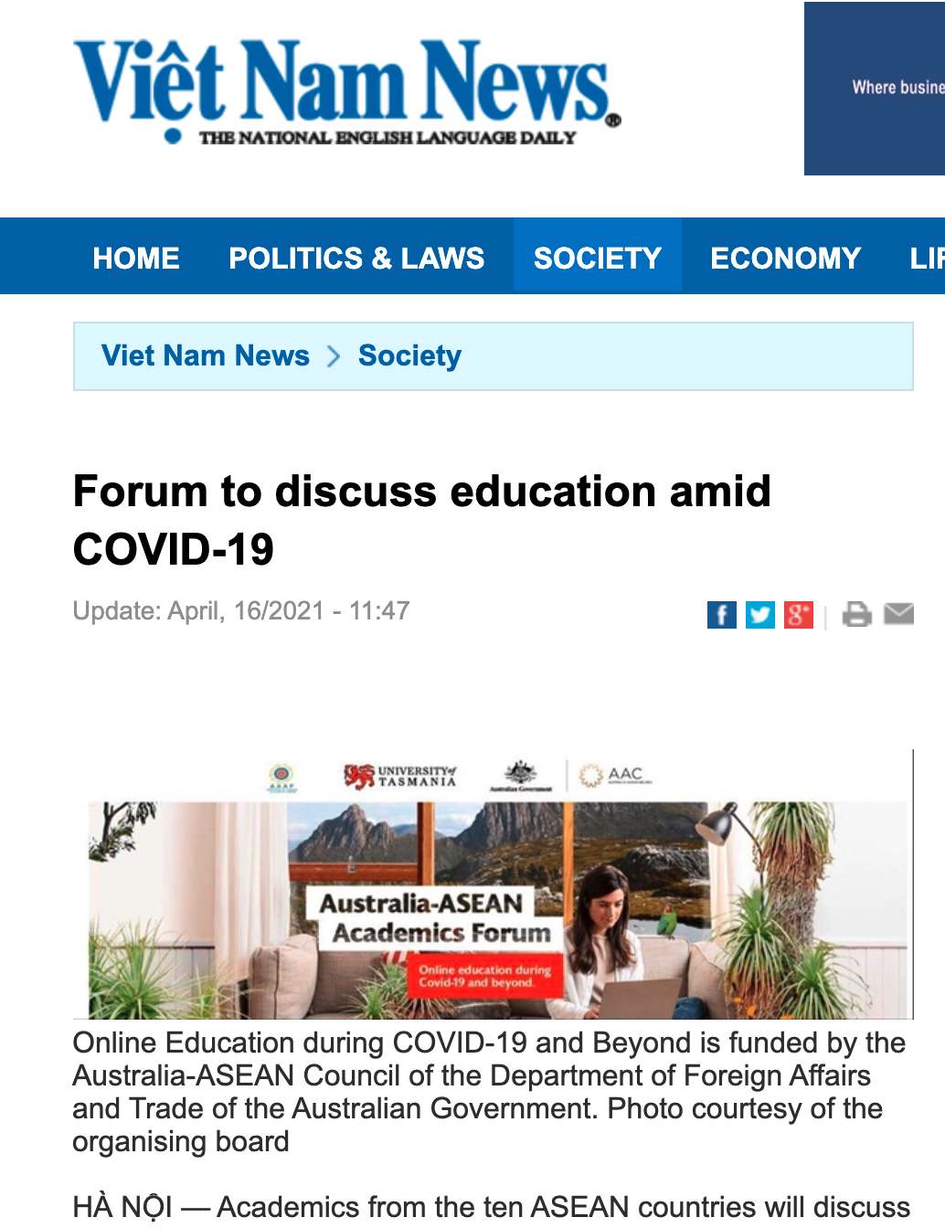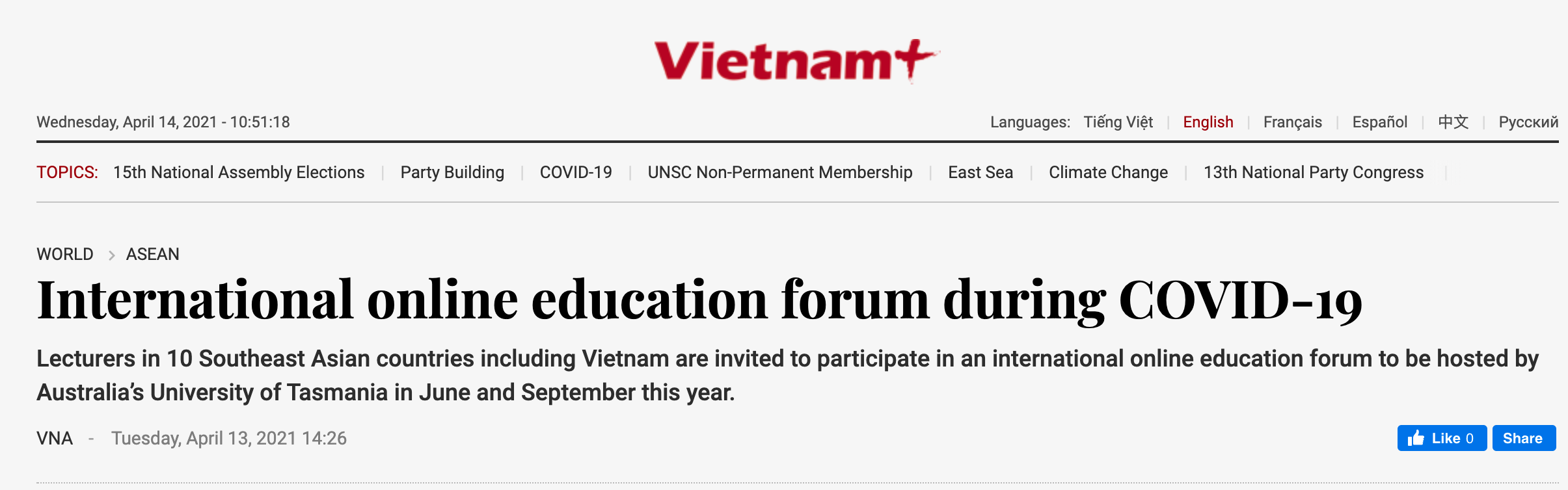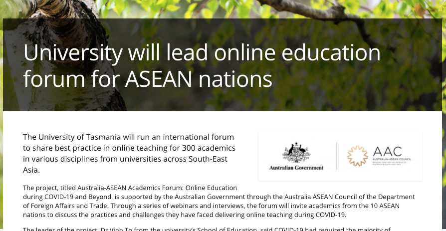 In the news https://www.utas.edu.au/communications/general-news/all-news/university-will-lead-online-education-forum-for-asean-nations https://www.examiner.com.au/story/7173650/how-the-experience-of-online-education-will-cross-borders/#:~:text=The%20conference%20will%20be%20held,date%20news%20to%20the%20community https://en.vietnamplus.vn/international-online-education-forum-during-covid19/200040.vnp https://vietnamnews.vn/society/926614/forum-to-discuss-education-amid-covid-19.html https://khoinghieptre.tuoitrethudo.com.vn/dien-dan-quoc-te-ve-giao-duc-truc-tuyen-thoi-ky-covid-19-nhung-thach-thuc-phai-doi-mat-27668.html?fbclid=IwAR2Cy4DDP8T0uWItFbw-zQ7TZrwxBk-6E2lElfW0_klF7iodlFlqlsXPvGI https://tuoitrethudo.com.vn/dien-dan-quoc-te-ve-giao-duc-truc-tuyen-thoi-covid-19-nhung-thach-thuc-phai-doi-mat-159705.html https://khoinghieptre.tuoitrethudo.com.vn/khai-mac-dien-dan-giao-duc-truc-tuyen-quoc-te-uc-va-asean-27880.html https://en.qdnd.vn/asean-community/asean-news/australia-asean-online-education-forum-held-533090 https://universitytasmania.sharepoint.com/sites/news-and-events/SitePages/Connecting-with-our-neighbours-through-education.aspx Share this: Share on X (Opens in new window) X Share on Facebook (Opens in new window) Facebook Like Loading...