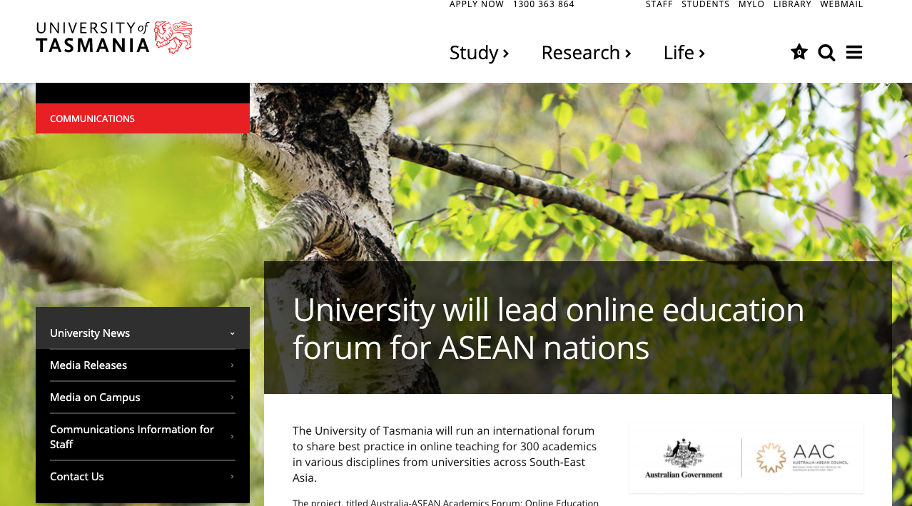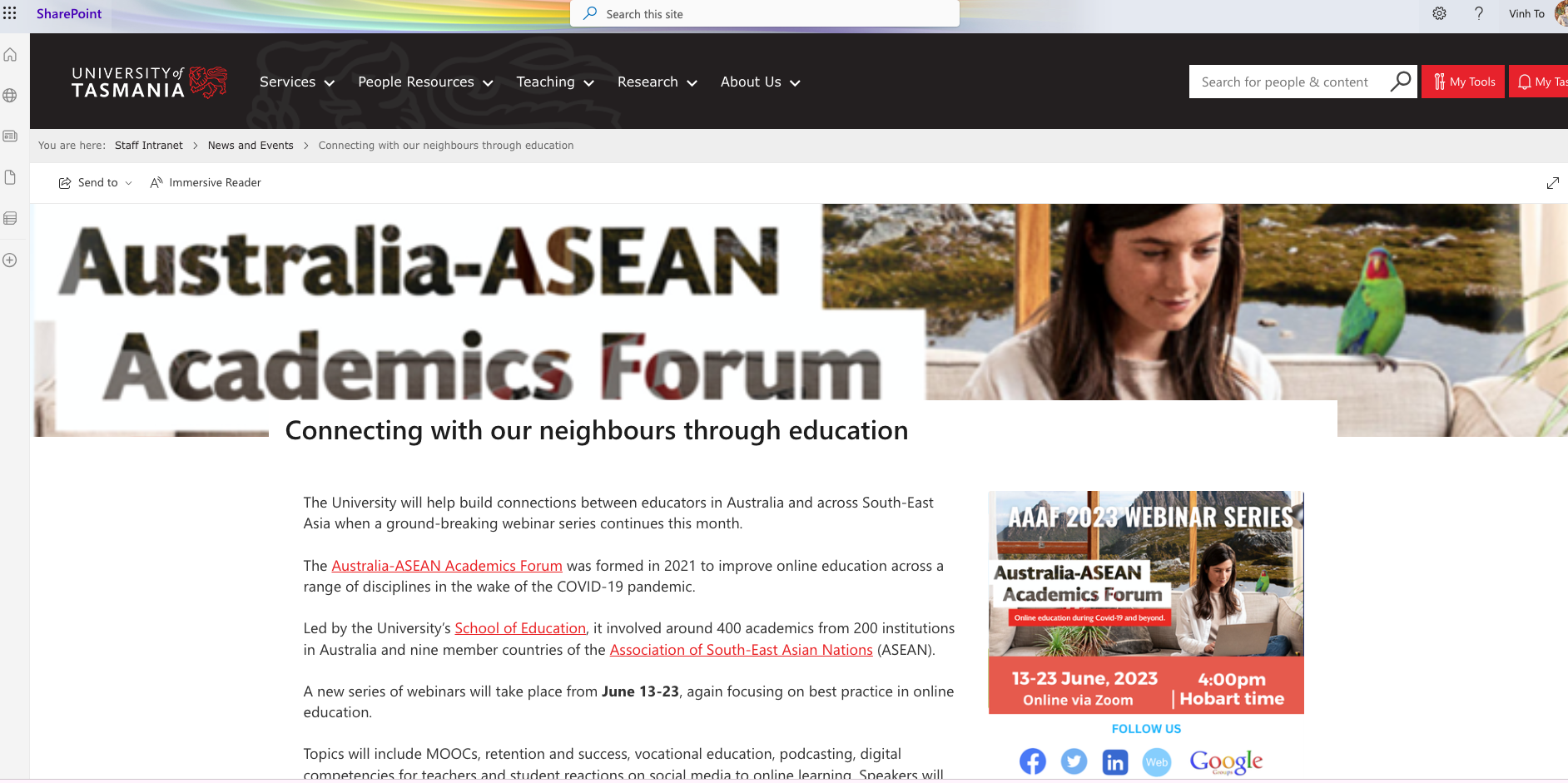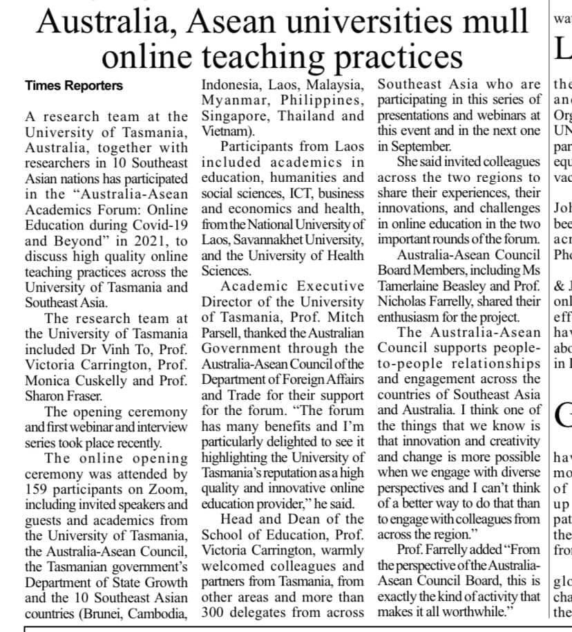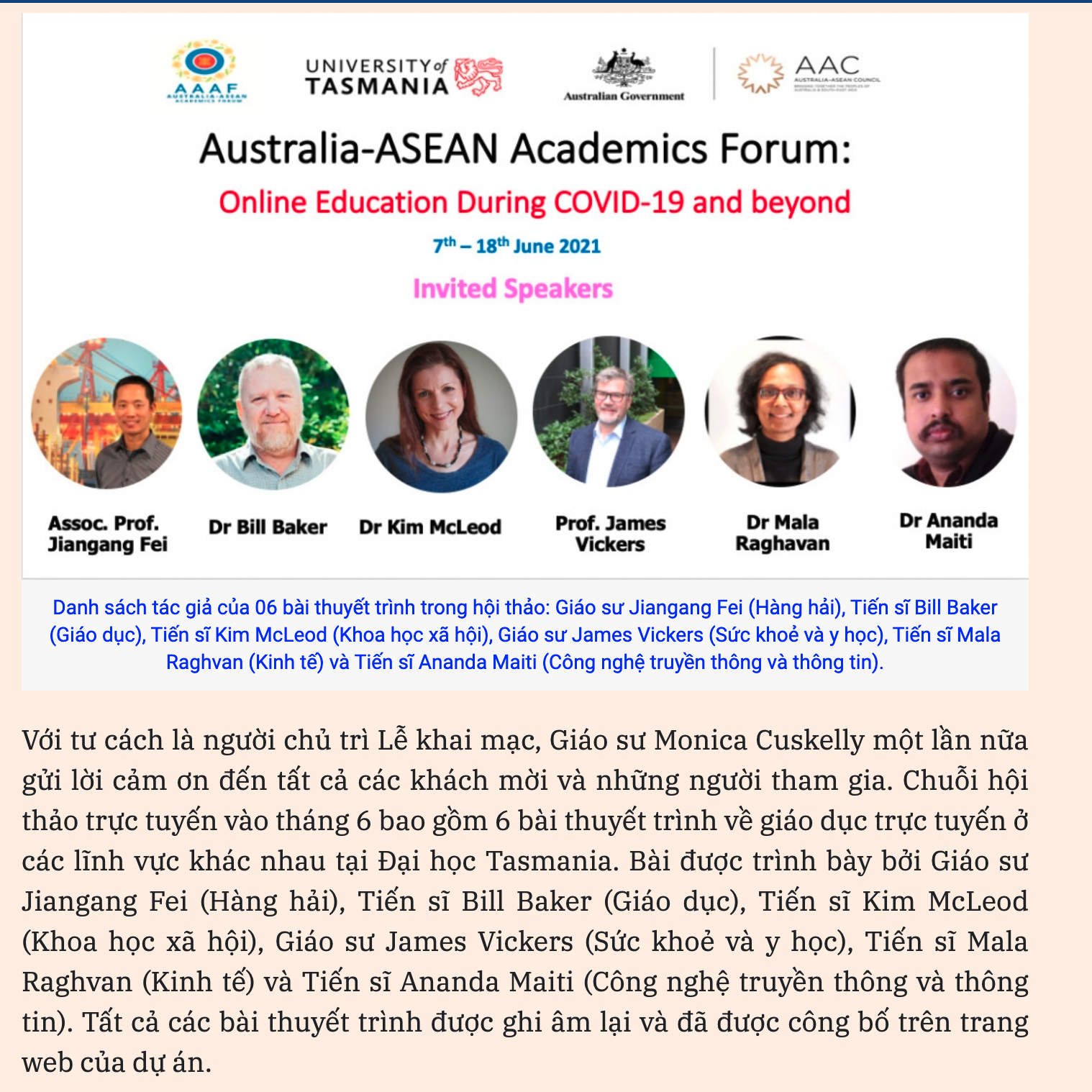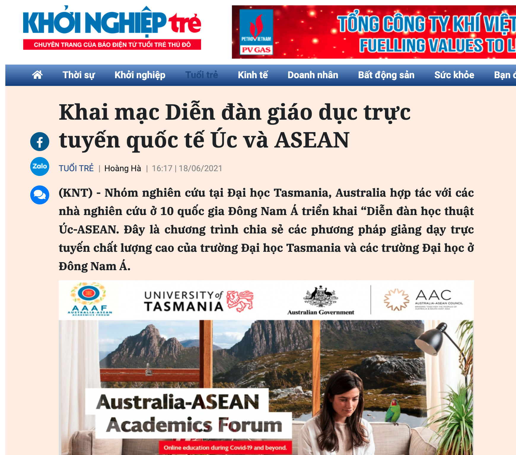 In the news https://www.utas.edu.au/communications/general-news/all-news/university-will-lead-online-education-forum-for-asean-nations https://www.examiner.com.au/story/7173650/how-the-experience-of-online-education-will-cross-borders/#:~:text=The%20conference%20will%20be%20held,date%20news%20to%20the%20community https://en.vietnamplus.vn/international-online-education-forum-during-covid19/200040.vnp https://vietnamnews.vn/society/926614/forum-to-discuss-education-amid-covid-19.html https://khoinghieptre.tuoitrethudo.com.vn/dien-dan-quoc-te-ve-giao-duc-truc-tuyen-thoi-ky-covid-19-nhung-thach-thuc-phai-doi-mat-27668.html?fbclid=IwAR2Cy4DDP8T0uWItFbw-zQ7TZrwxBk-6E2lElfW0_klF7iodlFlqlsXPvGI https://tuoitrethudo.com.vn/dien-dan-quoc-te-ve-giao-duc-truc-tuyen-thoi-covid-19-nhung-thach-thuc-phai-doi-mat-159705.html https://khoinghieptre.tuoitrethudo.com.vn/khai-mac-dien-dan-giao-duc-truc-tuyen-quoc-te-uc-va-asean-27880.html https://en.qdnd.vn/asean-community/asean-news/australia-asean-online-education-forum-held-533090 https://universitytasmania.sharepoint.com/sites/news-and-events/SitePages/Connecting-with-our-neighbours-through-education.aspx Share this: Share on X (Opens in new window) X Share on Facebook (Opens in new window) Facebook Like Loading...